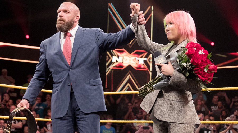 この日、米フロリダ州のフルセイル大で収録されたNXT大会のリングにウィリアム・リーガルGMと登場し、王座返上を発表したアスカは「NXTに来て約2年。多くのすばらしいスーパースターと対戦し、成長することができて感謝している。私はNXTを愛しています」と感謝の気持ちを口にした。またWWEのCEO、トリプルHから花束を受け取ったアスカは、NXT女子ベルトを手渡し返上した。